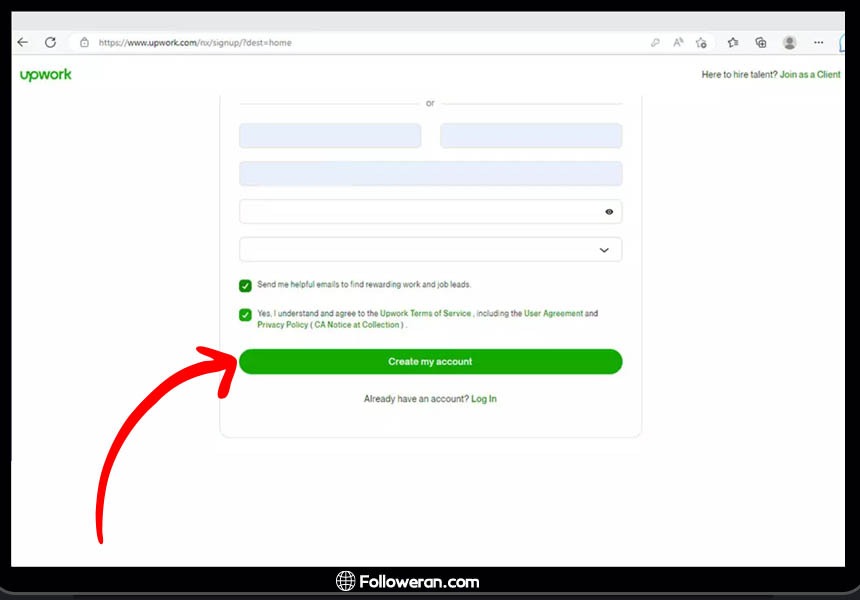 اکنون باید فرم ثبت نام را پر کنید. مشخصات خود مانند نام، نام خانوادگی، رمز عبور و کشور خود را مشخص کنید. سپس با زدن تیک با شرایط و قوانین Upwork موافقت نمایید.