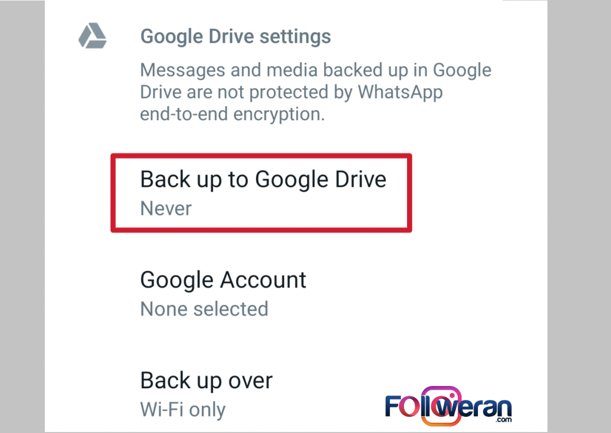 - در قسمت Chat back up روی عبارت Back up to Google drive کلیک کنید